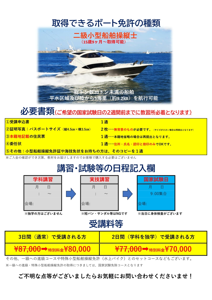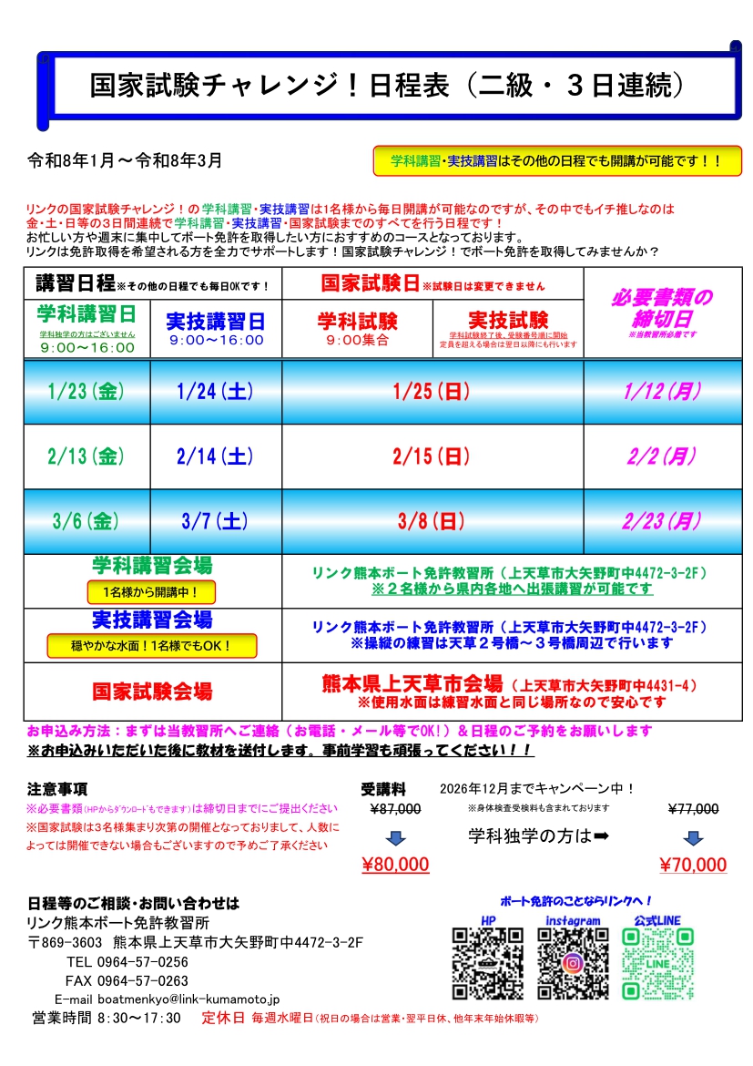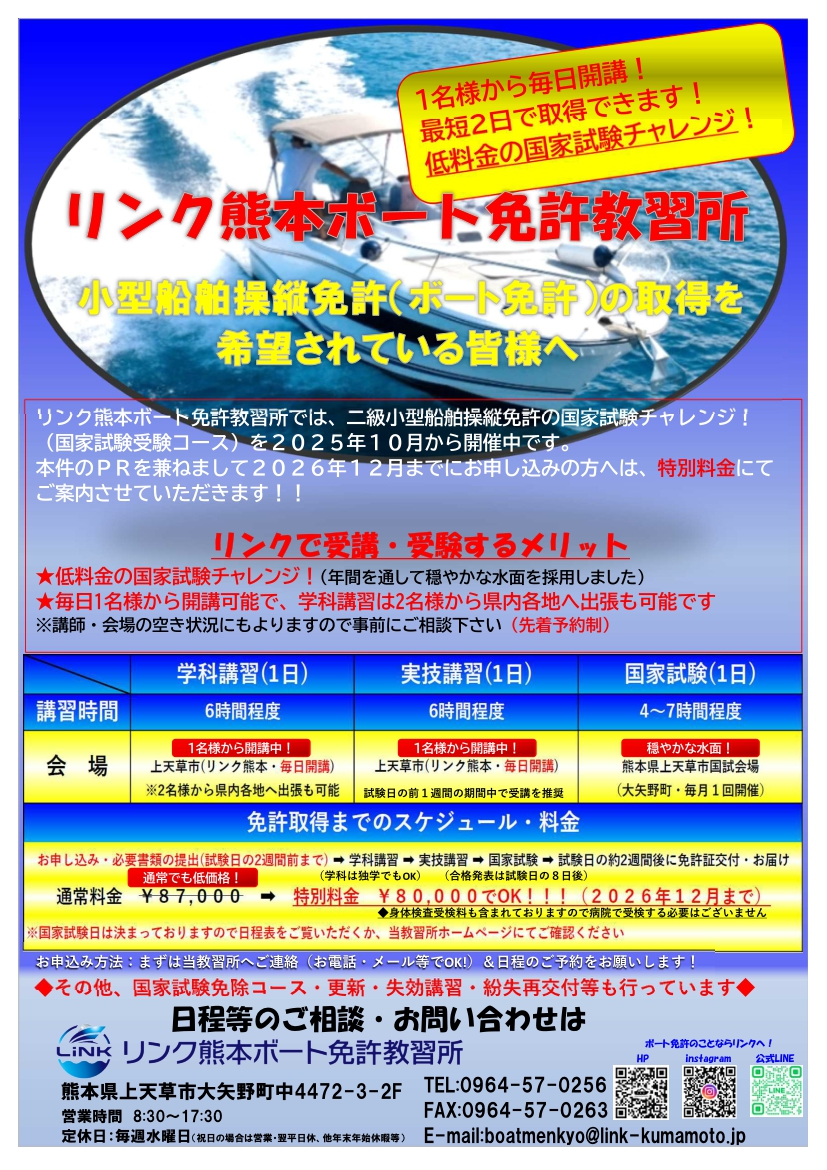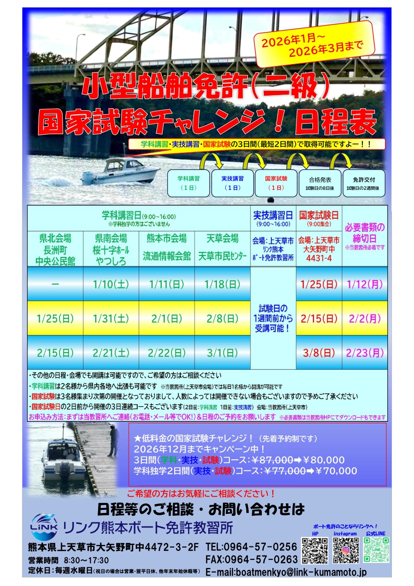 このページは、リンク熊本ボート免許教習所で毎月1回開催している「国家試験チャレンジ!」を検討されている方や、お申し込みをご希望の方へのご案内となっております。