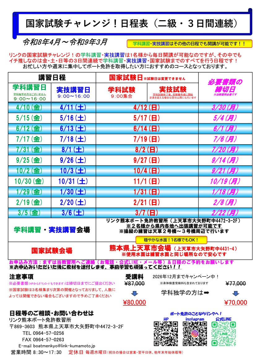 ②金・土・日の3日間連続で集中して取得をご希望の方用(学科講習・実技講習・試験すべて上天草市)
